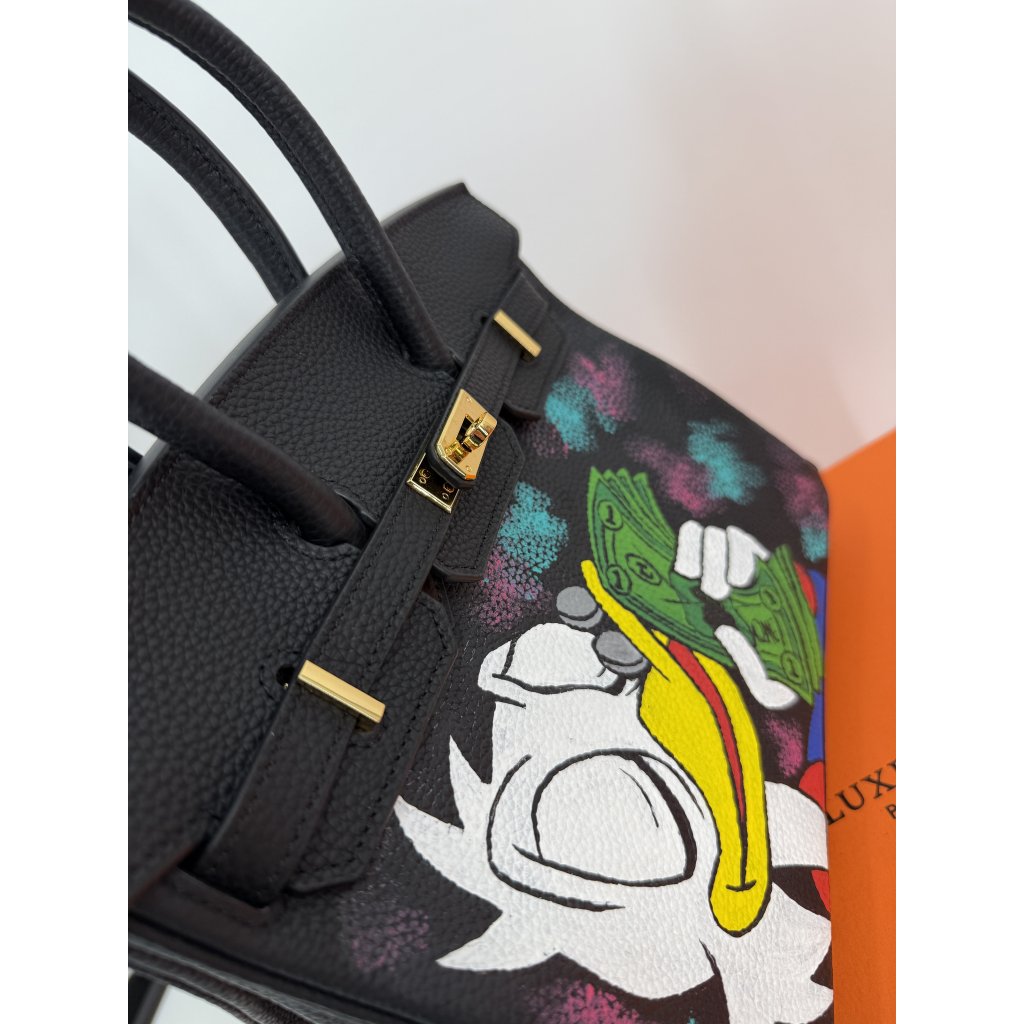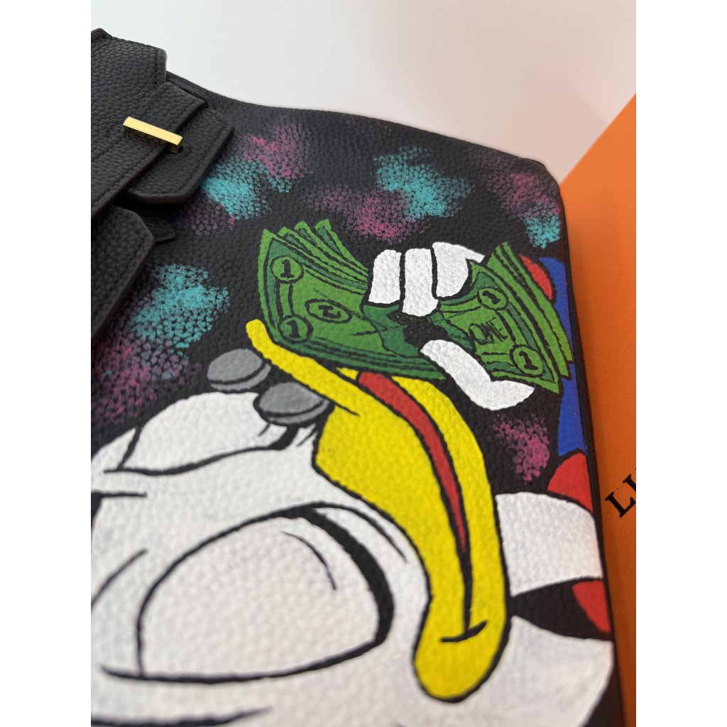 Tato kabelka není jen doplněk – je to sběratelský kousek. Model Rich Duck Cash Flow 1/1 by Luxelle Paris vznikl jako jediný originál, ručně malovaný na pravou kůži speciálními barvami určenými na kožené výrobky. Barevný motiv kačera s bankovkami a kontrastní „splash“ efekty dodávají klasické siluetě výrazný street-art nádech a dělají z ní nepřehlédnutelný kousek.