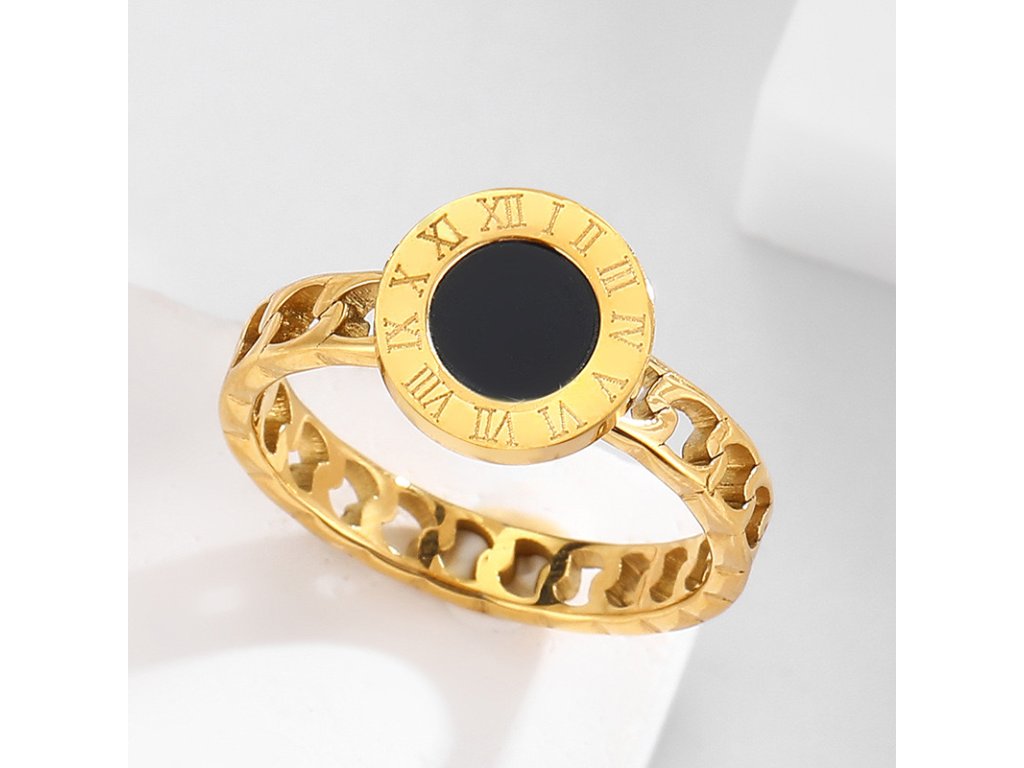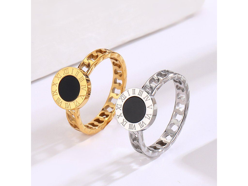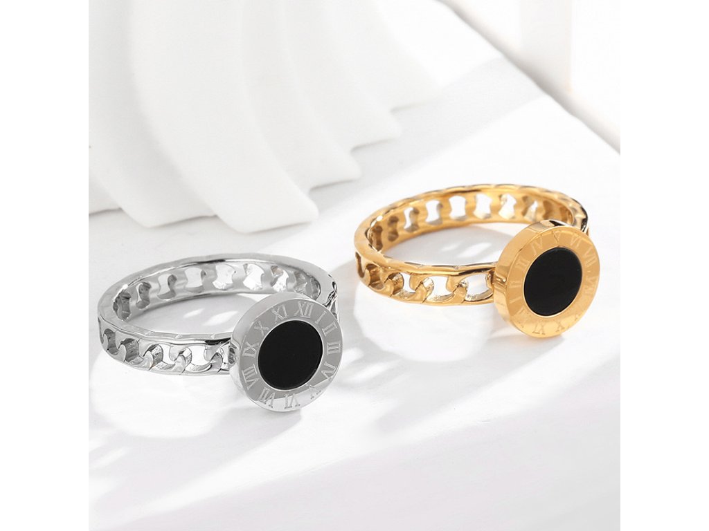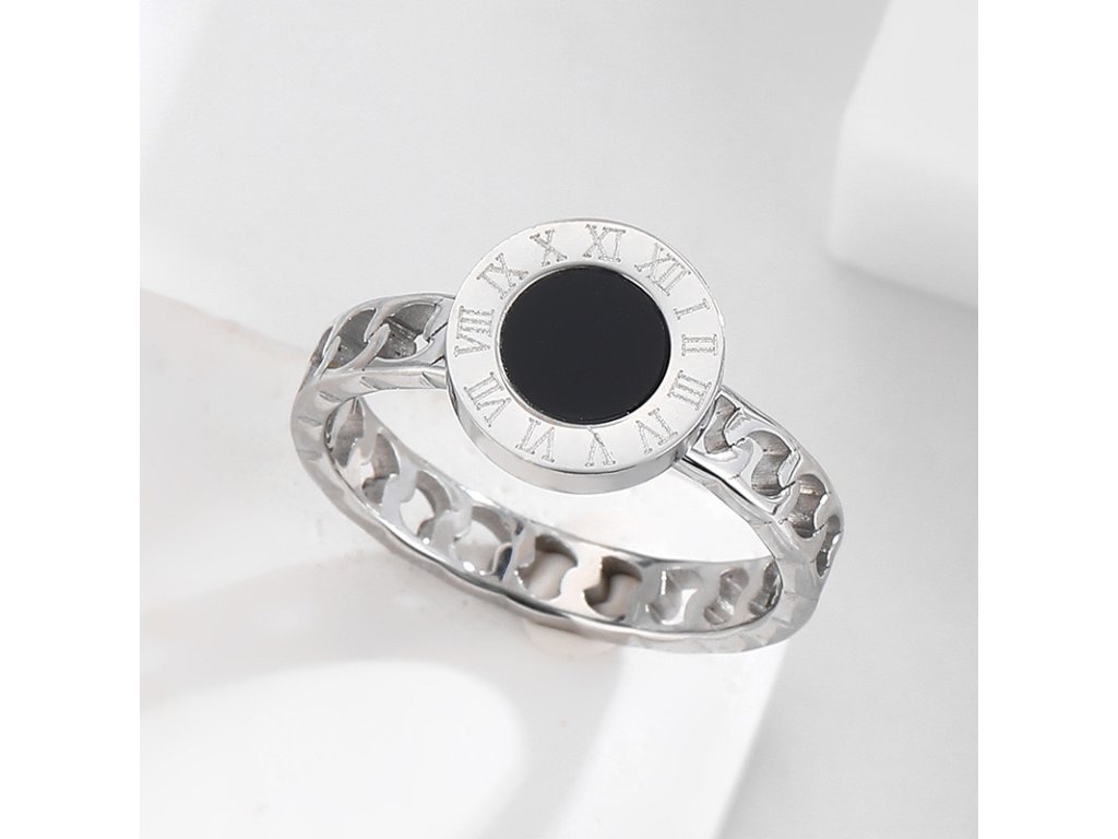 Čierny stred predstavuje vnútornú rovnováhu a tajomno, zatiaľ čo elegantný kruh s rímskymi číslicami pripomína, že čas je tým najvzácnejším, čo máme. Prepracovaný článkový pásik dodáva prsteňu moderný, odvážny vzhľad.
