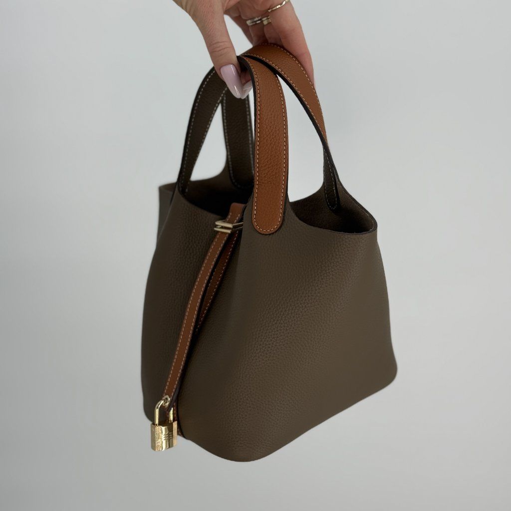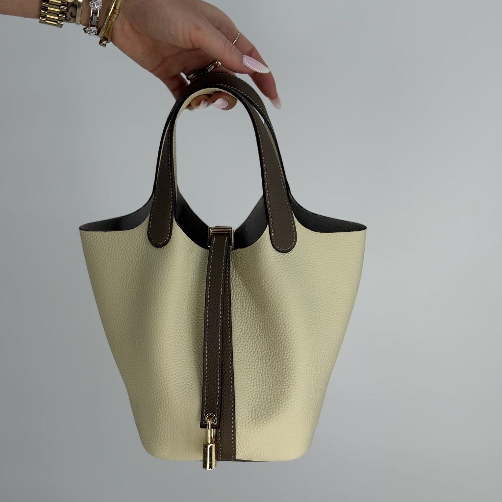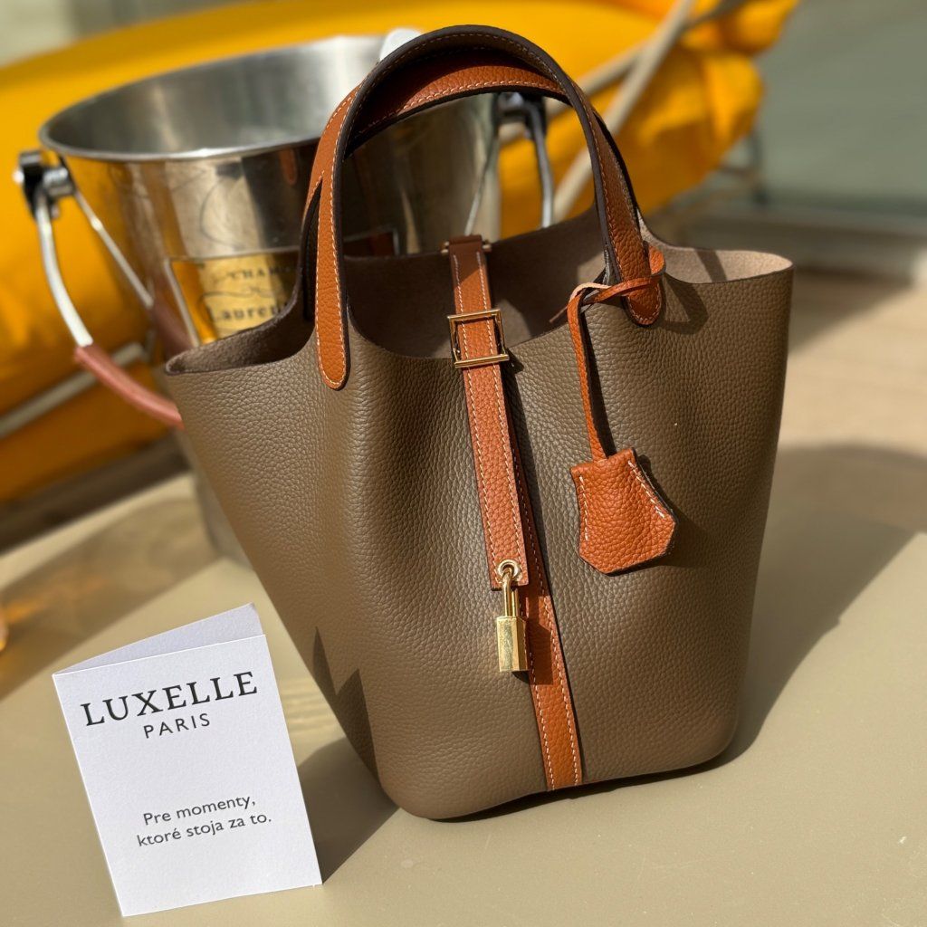 🪄 Mini Bucket by Luxelle Paris – roztomilá „must-have“ do ruky. Mäkká koža, kontrastný remienok so zámkom , kovové nožičky a nadčasový tvar.