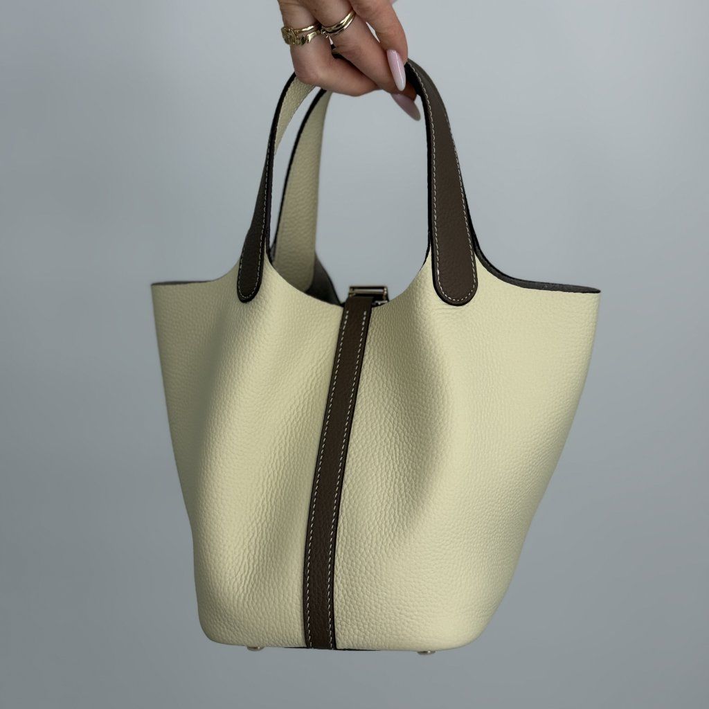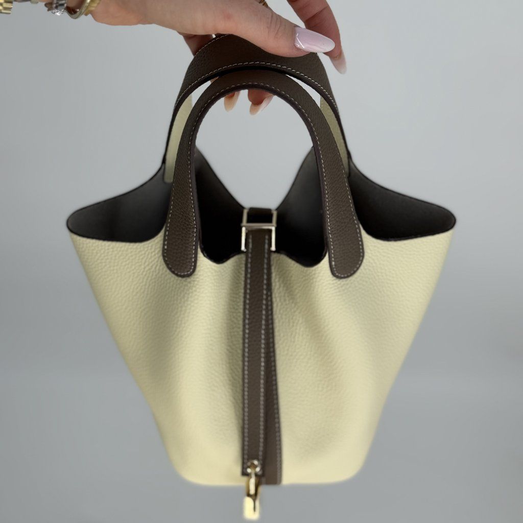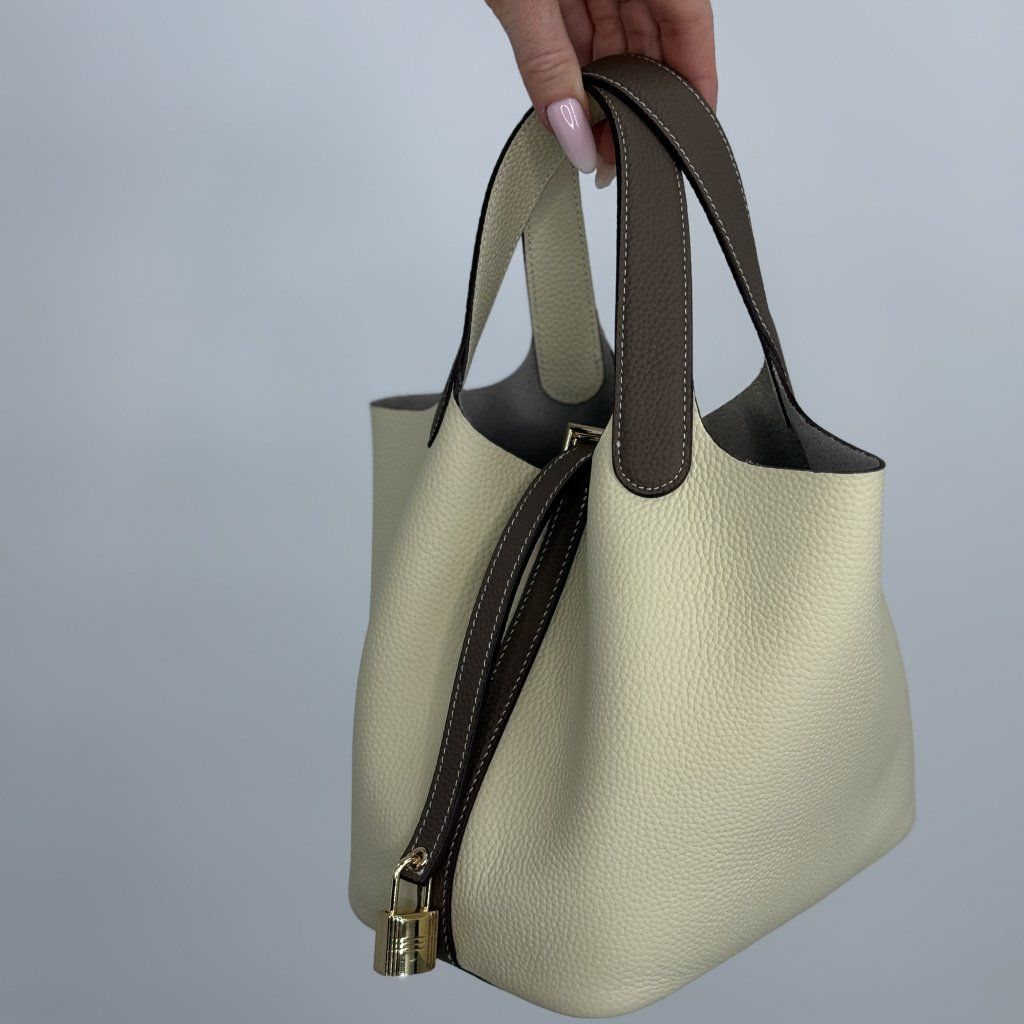 🪄 Mini Bucket by Luxelle Paris – roztomilá „must-have“ do ruky. Mäkká koža, kontrastný remienok so zámkom , kovové nožičky a nadčasový tvar.